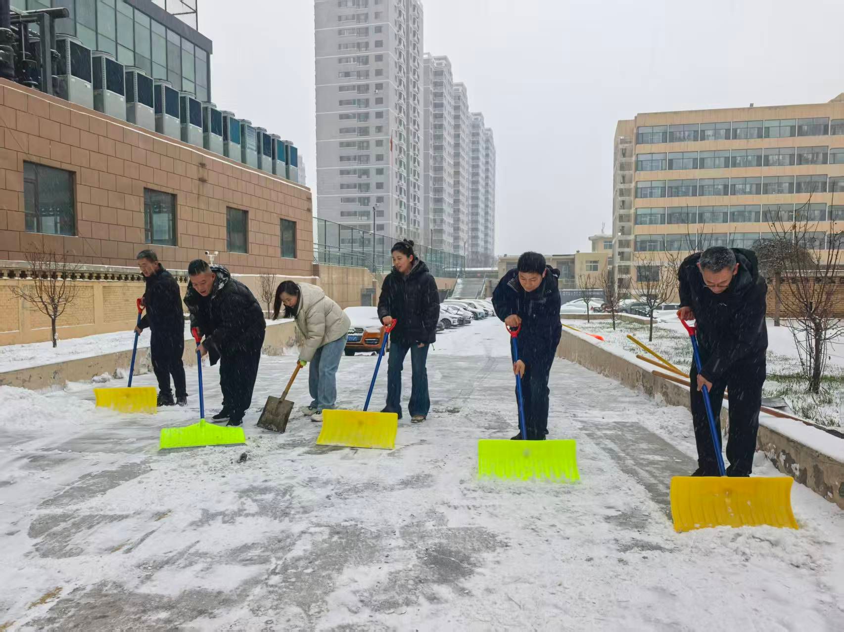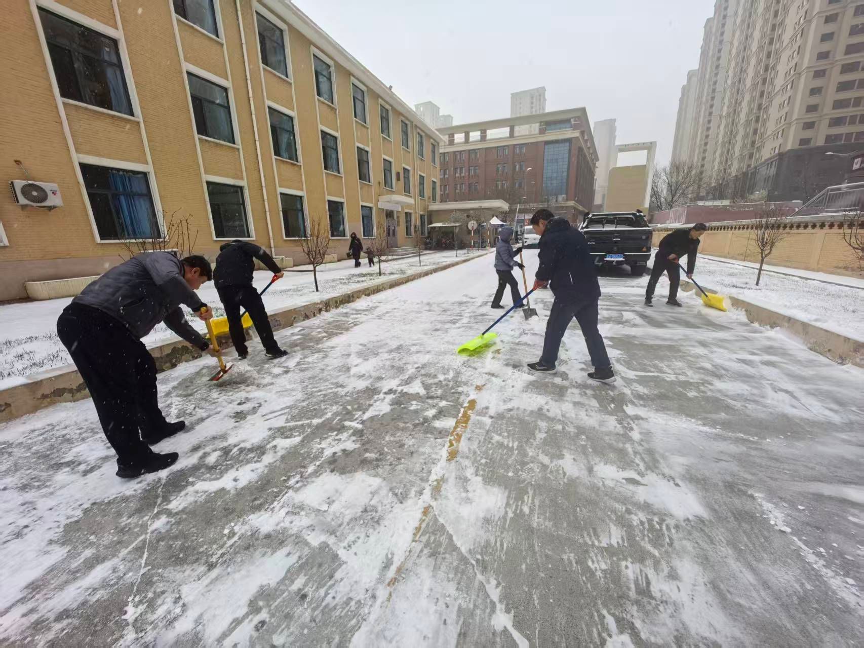 经过数小时奋战,校园主要通行区域积雪全部清理完毕,有效保障了教学秩序正常开展和师生出行安全,用责任与温暖驱散了冬日寒意。