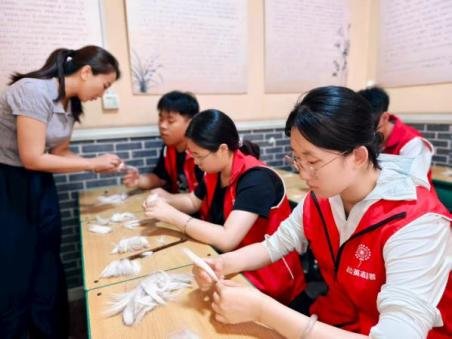 走进制作室,成员们迫不及待参与到绛笔制作流程中。他们指尖捻起一束兽毛,在老师的一步步引导下,小心翼翼地剔除杂毛,再拿起骨梳浸水后反复梳理,只为“千万毛中择一毫”,让每一根毫毛都服帖顺直,确保笔锋能精准达到 “齐、锐、圆、健” 的标准。从午后到日暮,成员们专注地重复着梳理、剔除的动作,指腹浸泡地发白起皱,虎口与手臂也泛起酸胀。这浸透汗水的一下午,让他们对制笔技艺有了更深刻的体悟:这七十余道精微的制笔工序背后不仅是大国匠人的艰辛与不易,更蕴含着“差之毫厘,谬以千里” 的极致追求。