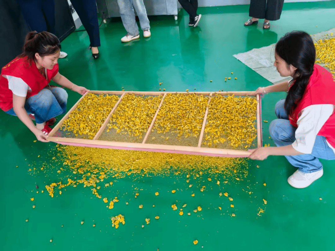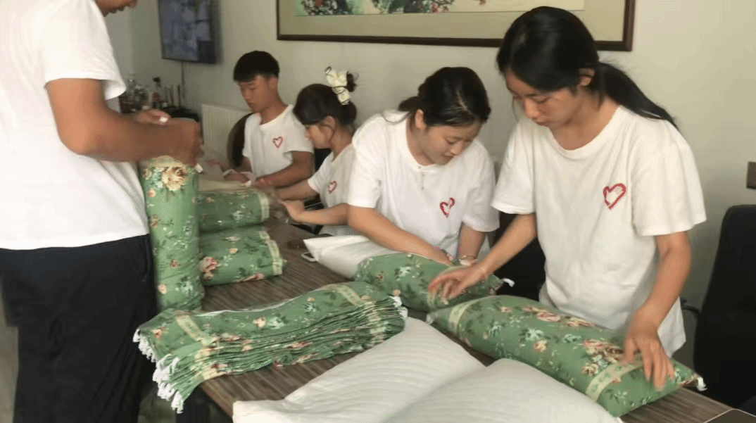 艾条制作有条不紊,晾晒干燥的艾叶经反复捶打制成细软艾绒,再被小心压实卷成艾条,队员感叹“艾条的青烟里藏着古人夏至防疫的智慧”;同时,队员们先对采摘的菊花进行初步筛选“体检”以剔除不合格个体,再从花型完整度、色泽、花瓣饱满度等维度分级挑选出优等品,随后大家分工协作,两人装枕心、两人套枕套、两人做外包装,按比例混合材料制作本草枕,一天共制成95余个,从本草到枕芯,步步藏匠心。