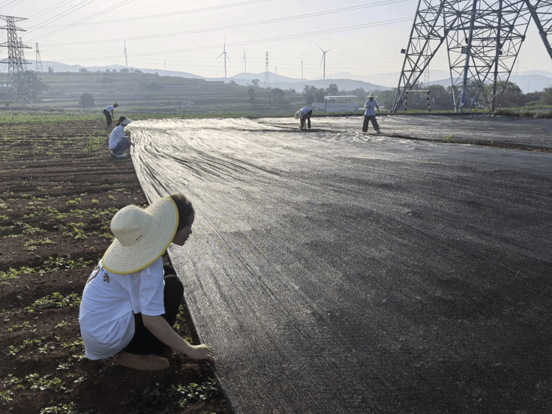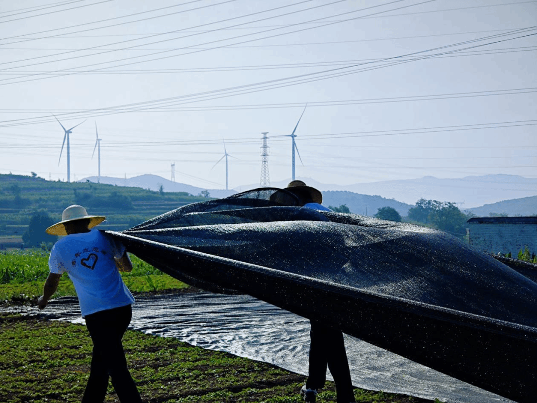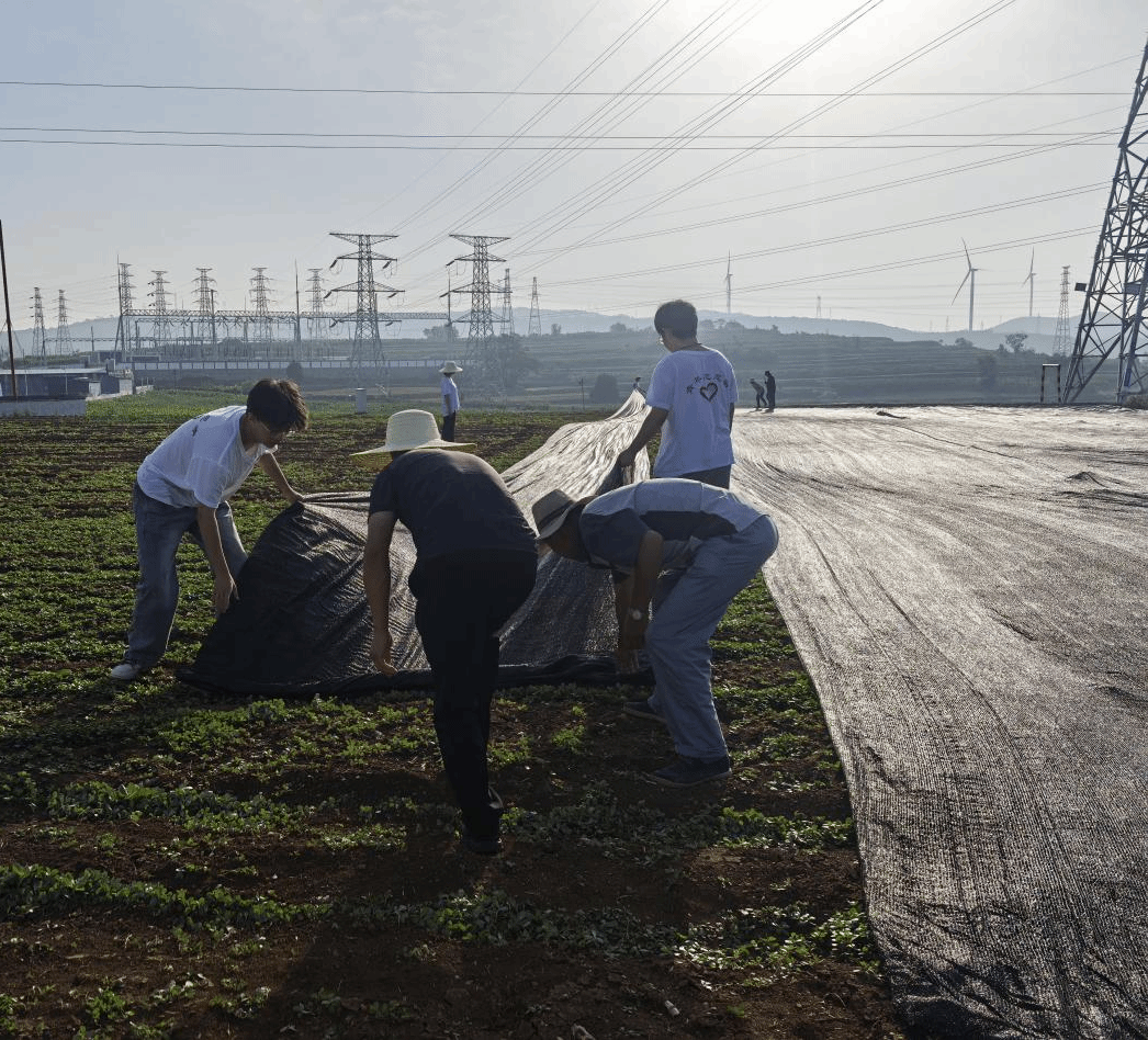 每日清晨7:00,队员们与村民一同下地,在村民指导下分辨杂草与决明子幼苗,体验疏松土壤、弯腰除草的农耕辛劳,烈日下汗水浸湿衣衫仍干劲十足。因持续高温使生长期的黄芩面临晒伤、脱水风险,队员们迅速分工,搬运材料、拉设网面,半天内为田垄覆盖好防晒网,既遮强光又保通风,有效降温,为作物筑牢“防护屏障”。