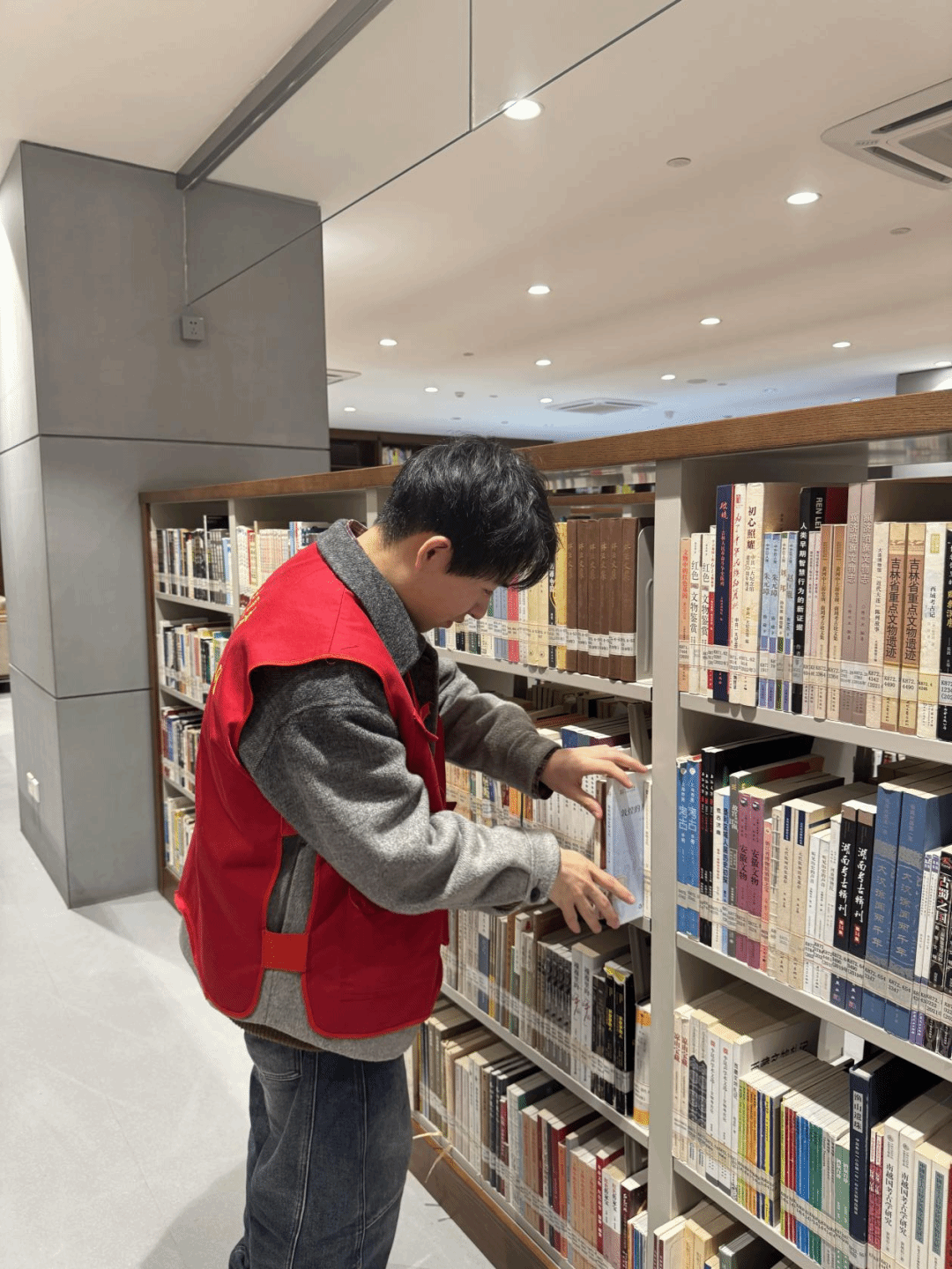 二楼外借区,6名志愿者则聚焦读者借阅需求,重点帮助大家熟悉自助借还书设备的操作流程。他们对归还的图书进行细致分类整理,并严格按照馆藏规则完成上架工作,同时为读者答疑解惑,涵盖图书检索、借阅期限、续期流程等一系列高频问题。