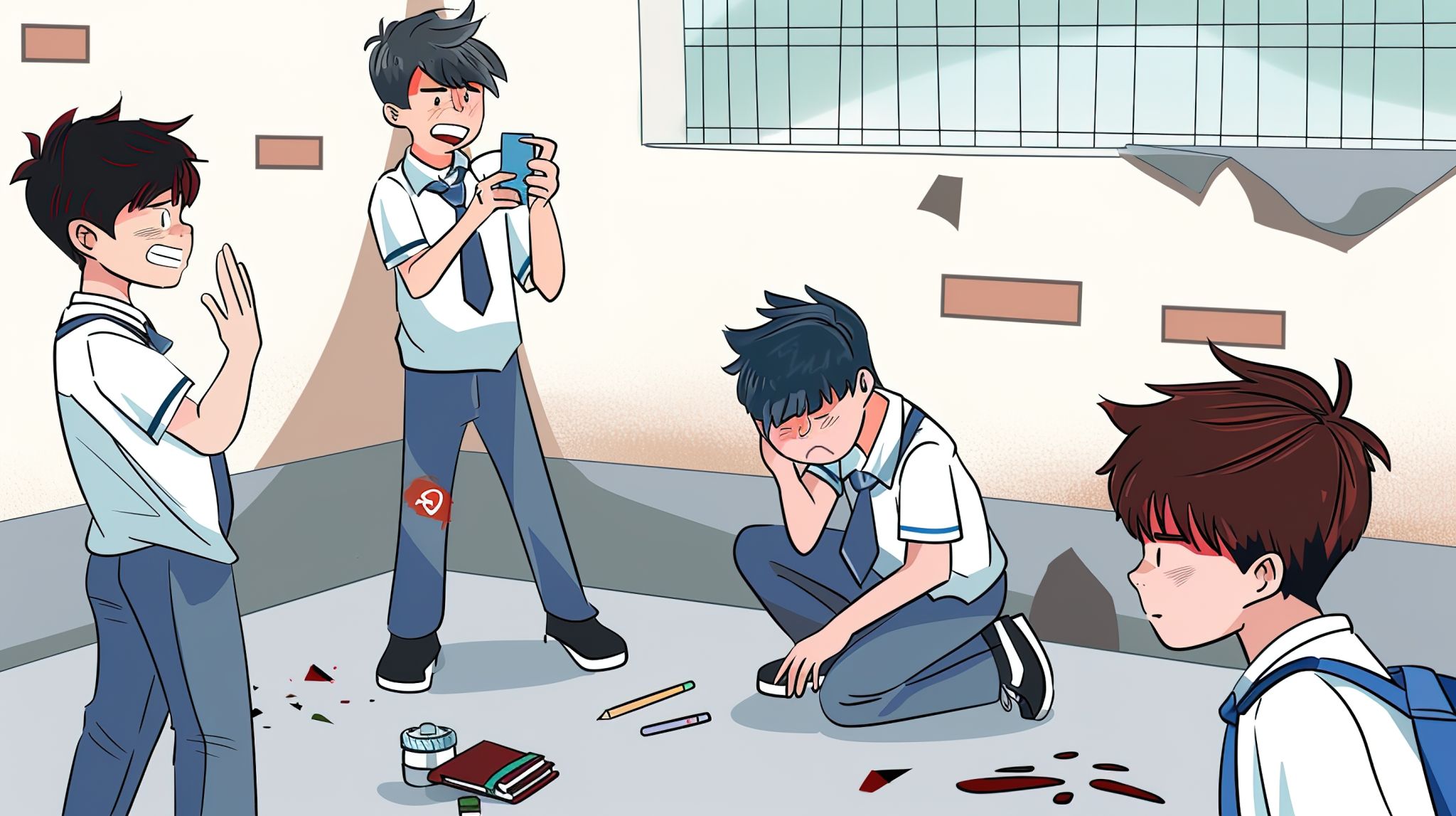 1.肢体欺凌:推搡、殴打、踢踹、围殴、宿舍内“教训”;