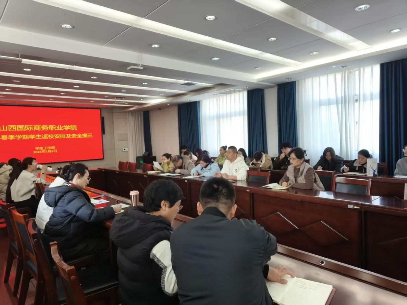 2026年3月6日9:30,在学院第一会议室组织召开了2026年春季学期学生返校安排及安全提示工作会。会议由学生工作部部长梁涛主持,参会人员有学生工作部工作人员、各系党总支书记、党总支副书记、团总支书记、全体辅导员。