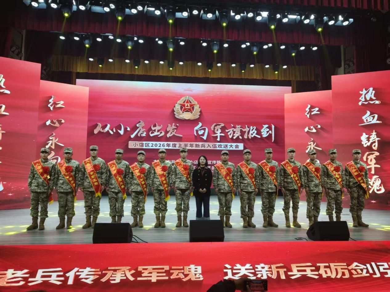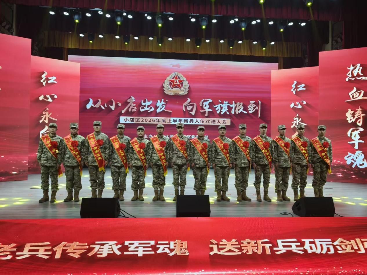 3月20日下午,我院学生工作部(人民武装部)工作人员及2026年春季入伍青年参加了小店区举行的2026年度上半年新兵入伍欢送大会,经过严格选拔,我院优秀学子孔祥瑞等14名同学光荣入伍,即将奔赴火热军营,代表商院青年,携笔从戎,参军报国。