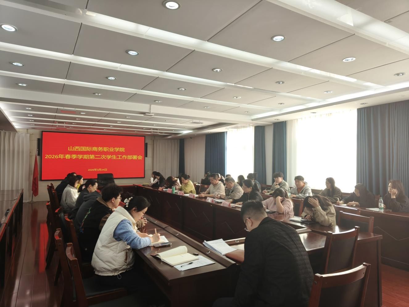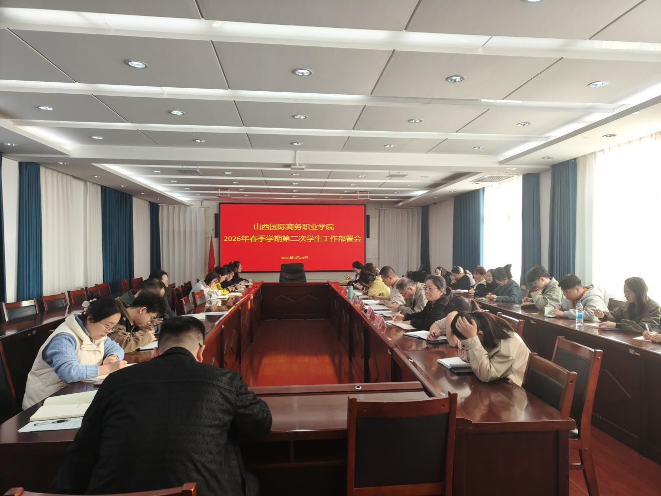 2026年3月24日17:00,在学院第一会议室组织召开了2026年春季学期第二次学生工作部署会。会议由学生工作部部长梁涛主持,参会人员有学生工作部工作人员、各系党总支书记、党总支副书记、团总支书记、全体辅导员。