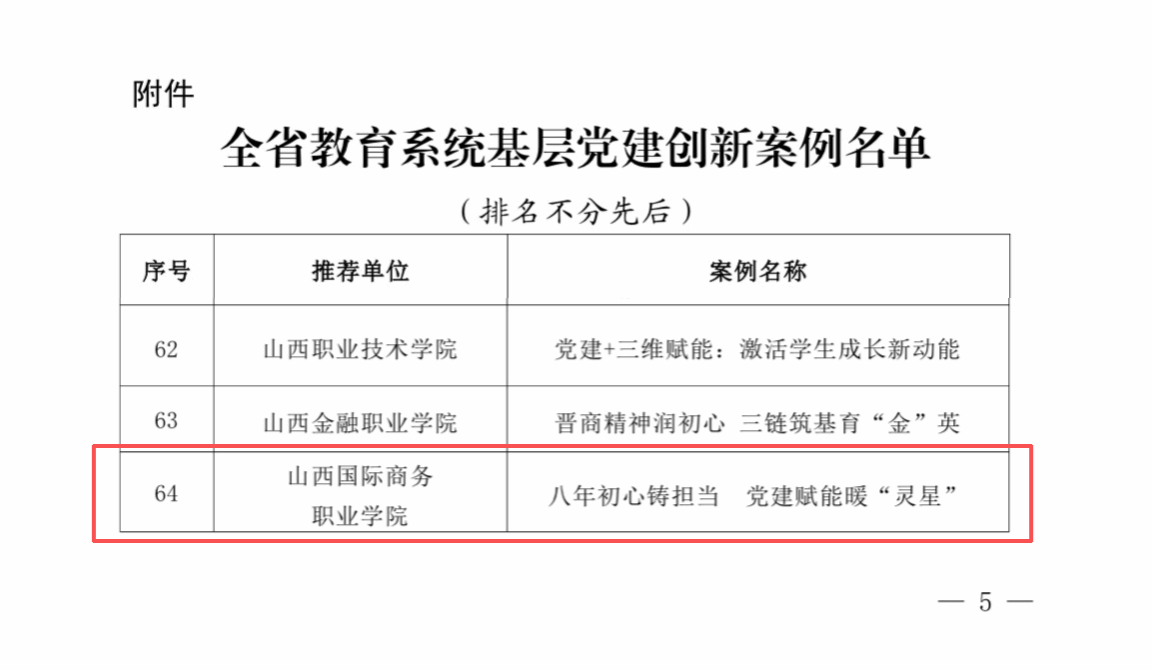 近日,山西省委教育工委公布了全省教育系统基层党建创新案例入选名单(《中共山西省委教育工作委员会关于公布全省教育系统基层党建创新案例的通知》晋教工委组函〔2025〕33号),我院信息技术系学工党支部报送的《八年初心铸担当 党建赋能暖“灵星”》党建创新案例成功入选。