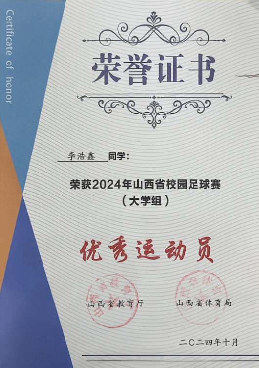 三年前,李浩鑫还是那个在绿茵场上纵情奔跑的足球少年。作为体育特长生,他的青春与汗水、拼搏与荣耀紧密相连。“奔跑吧·少年”山西省足球锦标赛、山西省校园足球赛高中组比赛、山西省校园足球赛大学组……一场场赛事记录着他的成长轨迹。与队友默契配合、奋勇拼搏,助力球队一路突围闯入四强,斩获山西省第四名。凭借过硬实力,他荣获2024年山西省校园足球赛(大学组)“优秀运动员”称号,并取得国家足球二级运动员证书。