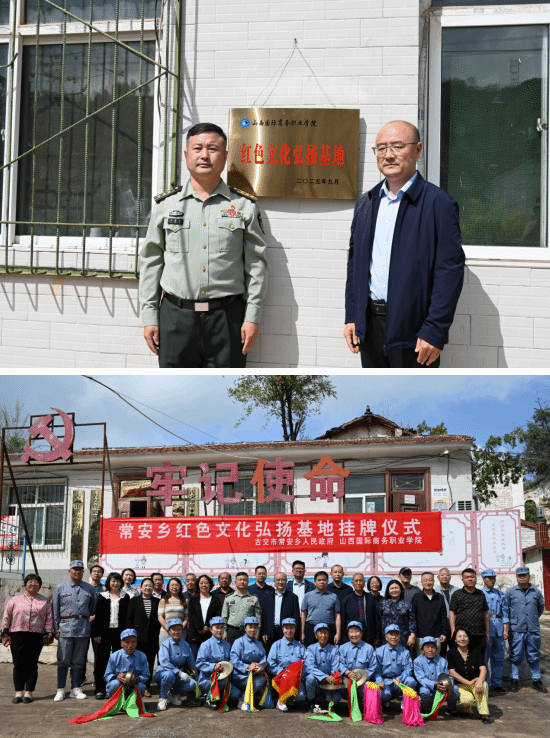 9月12日,我院与太原古交市常安乡共建的“红色文化弘扬基地”举行挂牌仪式。学院党委委员、副院长王雅静,古交市委常委、人武部政委卢晋军,常安乡党委书记史德彪,党委副书记、乡长康贵平,南头村党支部书记郝成建出席仪式。学院基础部负责人李晓红及骨干教师、革命后代林立进夫妇参加仪式。挂牌仪式由学院宣传统战部部长韩丽红主持。