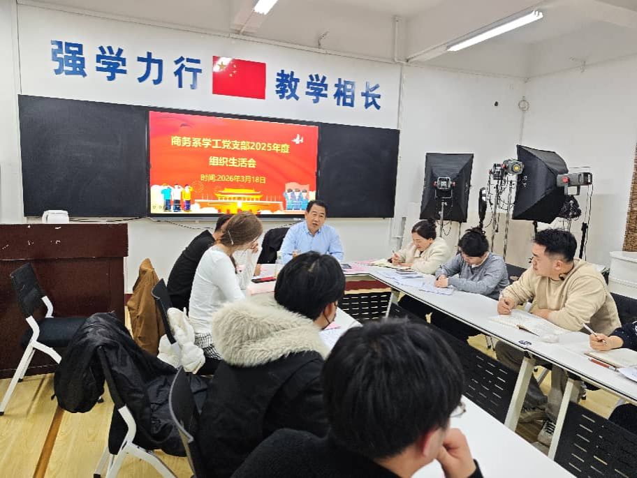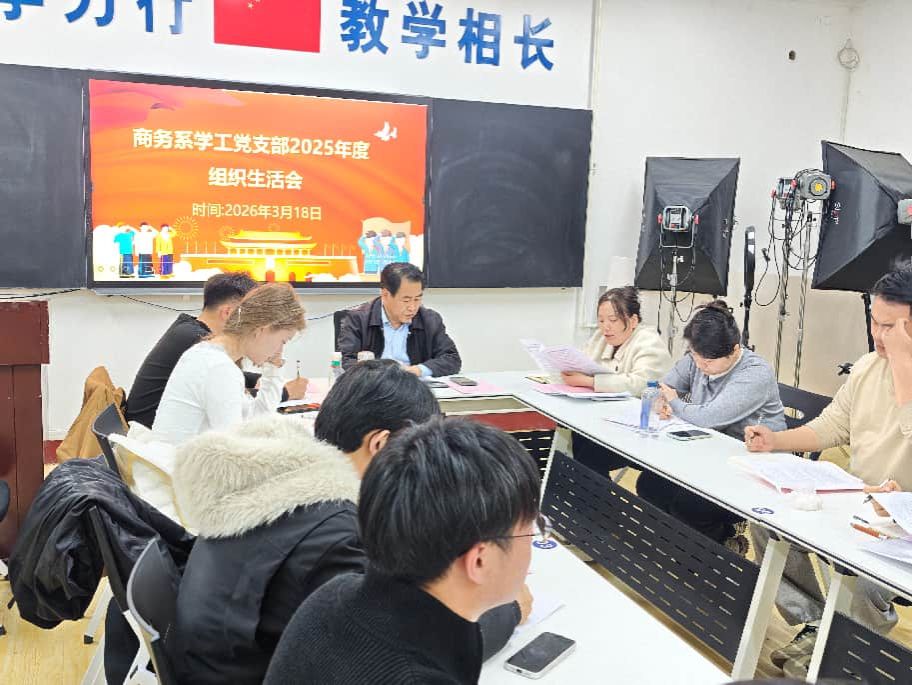 近日,商务系学工支部紧扣“深入学习贯彻习近平新时代中国特色社会主义思想,全面贯彻落实党的二十届四中全会精神,以打攻坚战、持久战的决心和恒心,锲而不舍落实中央八项规定精神,推进作风建设常态化长效化,以优良作风凝心聚力、真抓实干,奋力开创中国式现代化建设新篇章”主题,召开2025年度专题组织生活会。会议由学工支部书记李月娥主持,支部全体党员、预备党员参加,学院党委副书记王爱民到会指导并作点评。