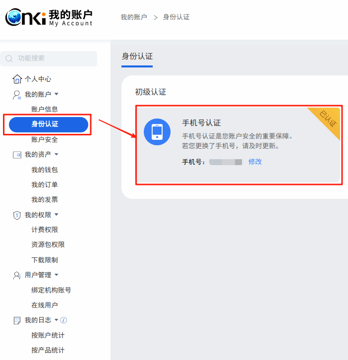 登录后,点击右上角“个人账号 ”处,然后选择“我的账户”,进入相应页面,进行“真实姓名”完善并进行“手机号认证”。