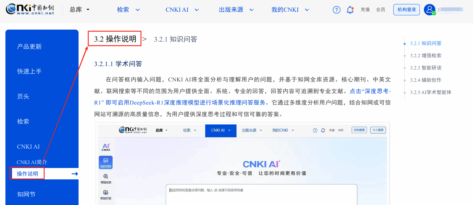 进入下方网址,点击“CNKI AI操作说明”进行查看。https://piccache.cnki.net/kdn/index/newhelper/manual.html#framequick-1
