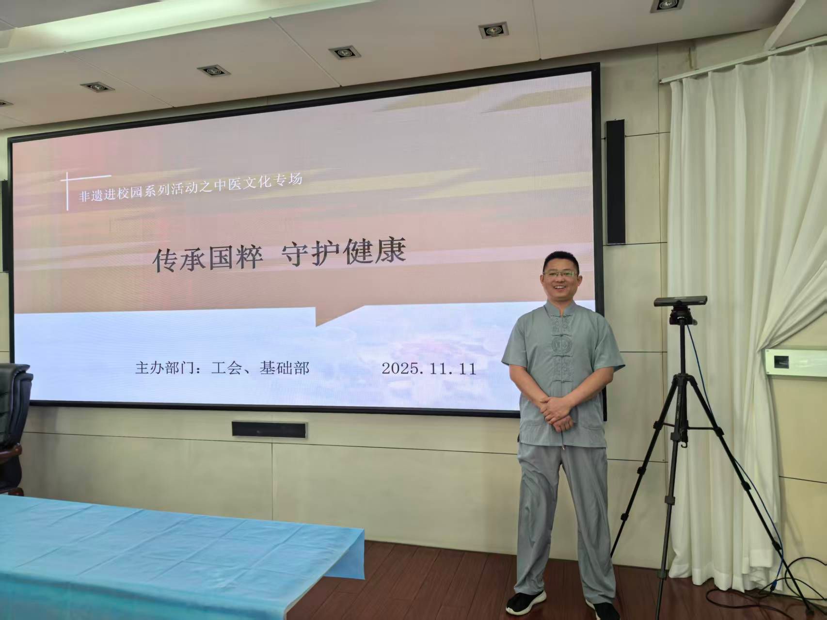 11月11日,在学院二楼会议室,“非遗进校园”系列活动迎来中医文化首场盛宴。面对现代生活带来的健康挑战与文化传承困境,基础部携院工会特邀张慧斌主任,为教师们开启了一场贯通古今智慧的健康守护之旅。张主任...